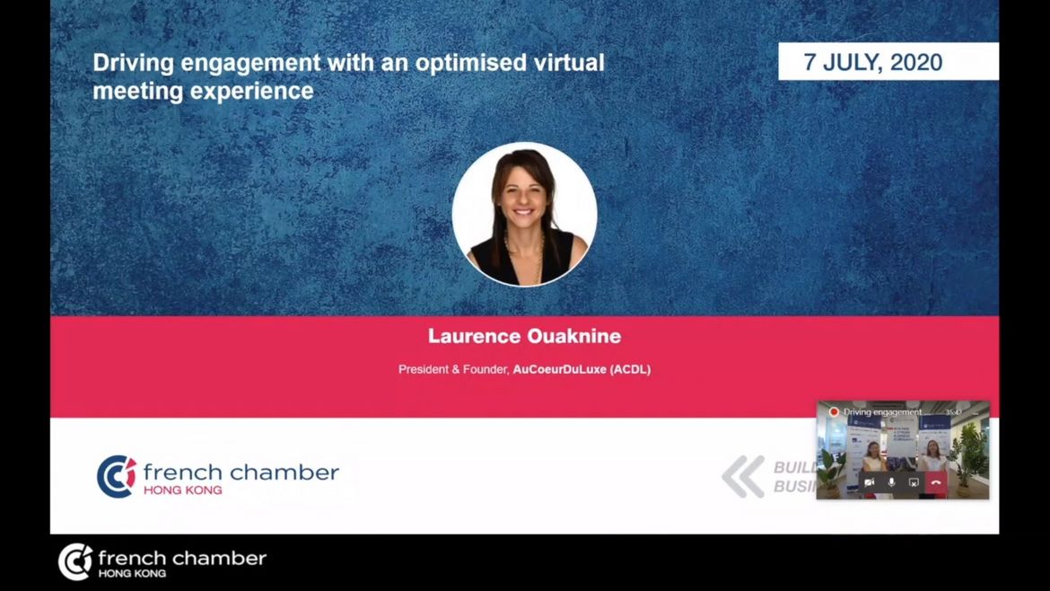 In this webinar, we learnt about the best practices to build an immersive and engaging virtual meeting thanks to Laurence Ouaknine (President & Founder, AuCoeurDuLuxe), who shared tips on delivering an engagement-driven experience with various tools. Laurence spoke about the importance of effectively engaging a community when planning your digital meetings.