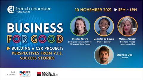 Join the latest instalment of our Business for Good series as we welcome award-winning V.I.E’s (French International Internship Program) from the Grand Prix V.I.E Hong Kong* as they recount their experience in building a Corporate Social Responsibility project within their company.