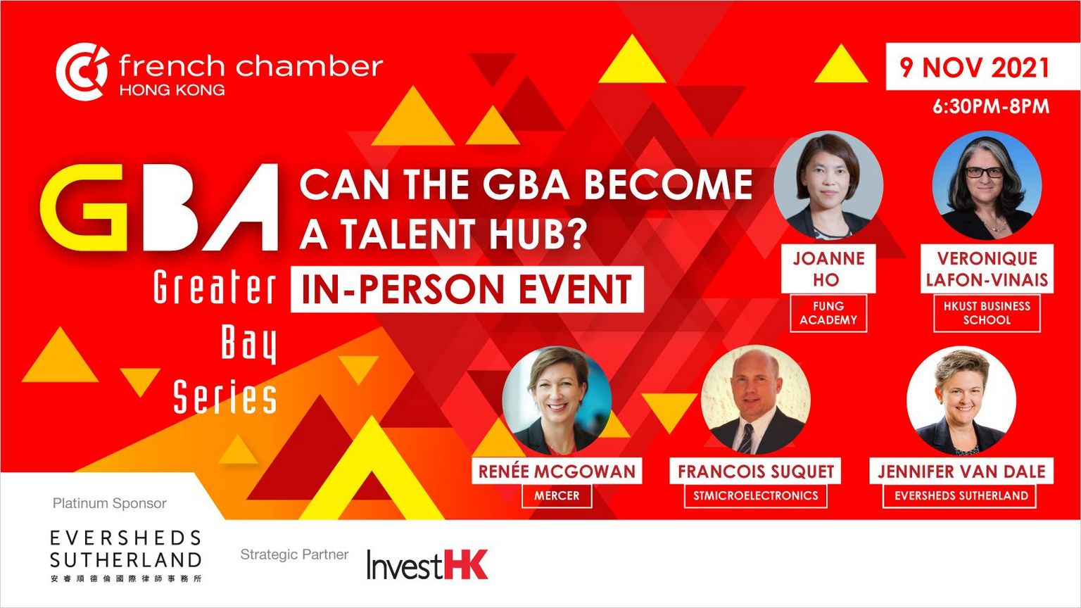 She will be followed by an expert panel comprised of Joanne Ho (COO, Fung Academy), Francois Suquet (Group Vice-President, Human Resources, Asia Pacific, STMicroelectronics), Veronique Lafon-Vinais (Executive Director, Career Development & Corporate Outreach, HKUST Business School), and moderator Jennifer Van Dale (Partner, Eversheds Sutherland).