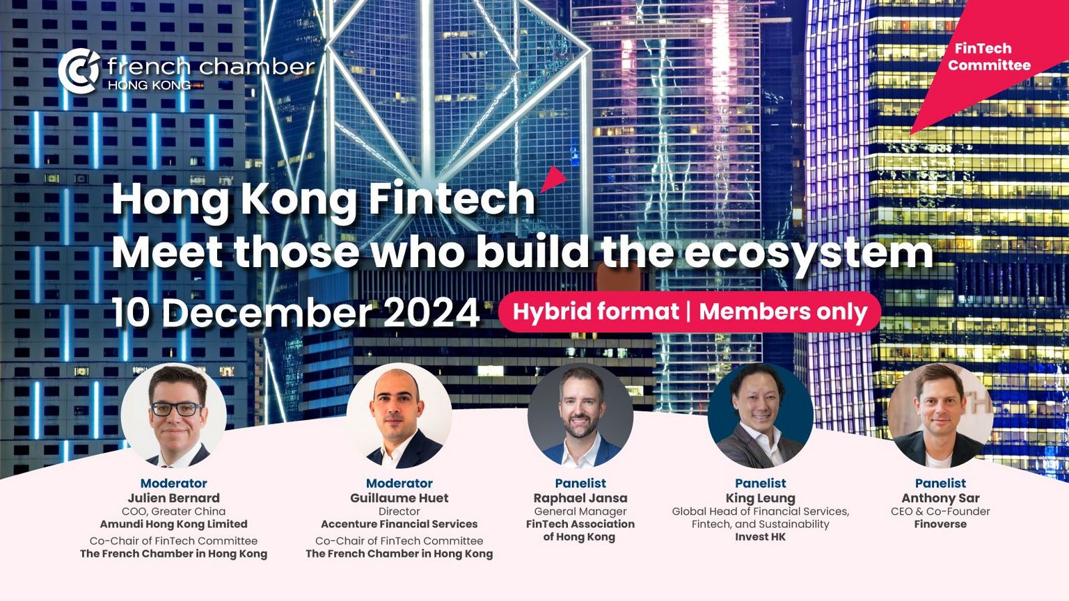 Join us to hear from Raphael Jansa, King Leung, and Anthony Sar about the landscape and key players in the HK Fintech. During this engaging discussion about the evolving landscape of Hong Kong's fintech ecosystem, featuring insights specifically designed for today’s innovators. We’ll explore key topics including: