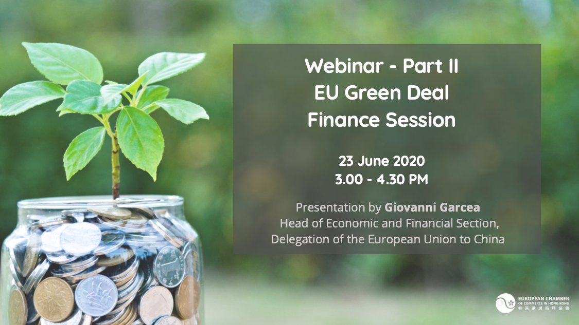 This session will cover the financial side of the Green Deal, followed by a moderated Q&A session open to your questions. Guest speaker Giovanni Garcea, Head of Economic and Financial Section at the EU Delegation to China will walk you through the proposed financial instruments and mechanisms which will help to enable the European Union’s planned Green Deal.