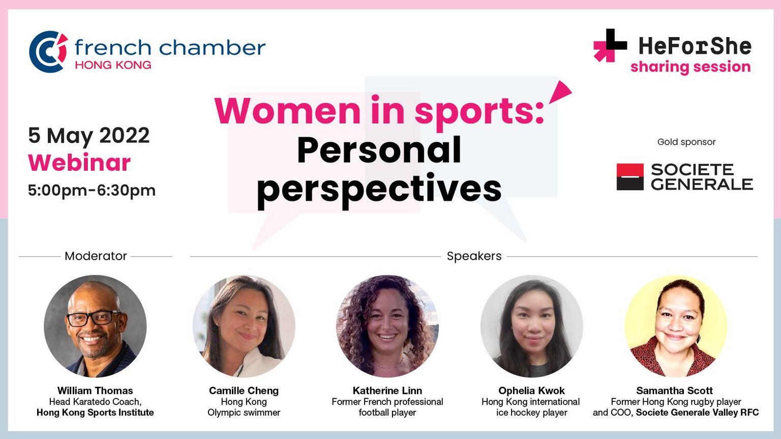 We are delighted to welcome our speakers, Samantha Scott, former Hong Kong rugby player and Chief Operations Officer at Societe Generale Valley RFC, Camille Cheng, Hong Kong Olympic swimmer, Katherine Linn, former French professional football player, and Ophelia Kwok, Hong Kong international ice hockey player.