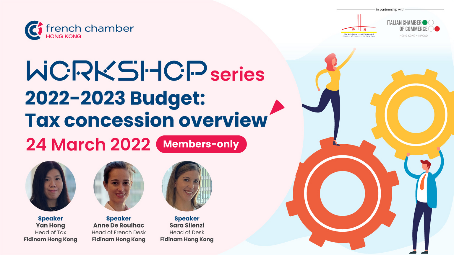 In light of this, the Italian Chamber of Commerce in Hong Kong and Macao, in partnership with the Belgium-Luxembourg Chamber of Commerce in Hong Kong and French Chamber in Hong Kong is delighted to invite you to this joint-chamber webinar “Overview of the 2022-2023 Budget - Tax Concession Measures”.