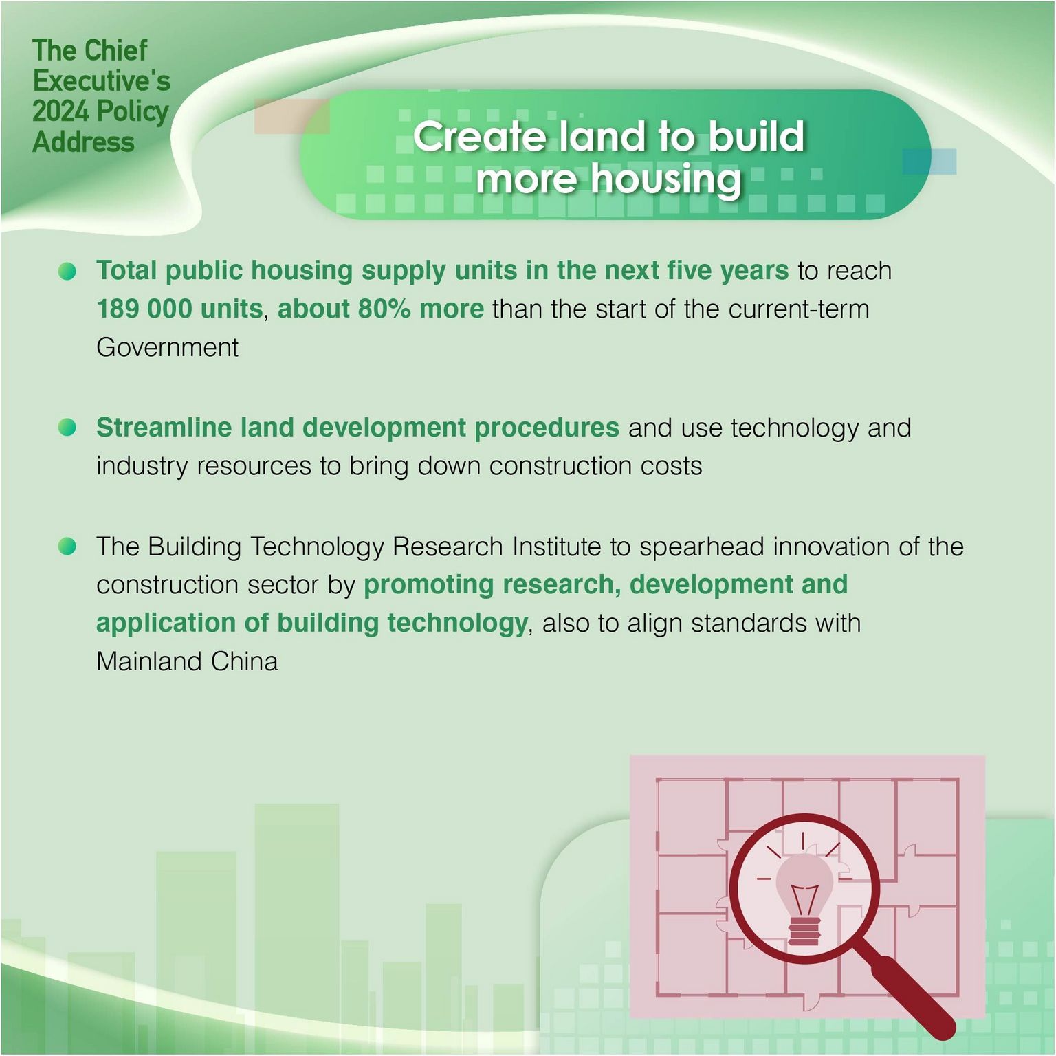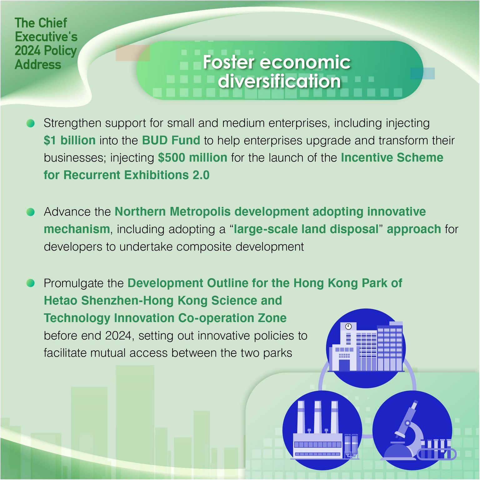 - Expedite the Northern Metropolis development, including adopting a pilot “large-scale land disposal” approach