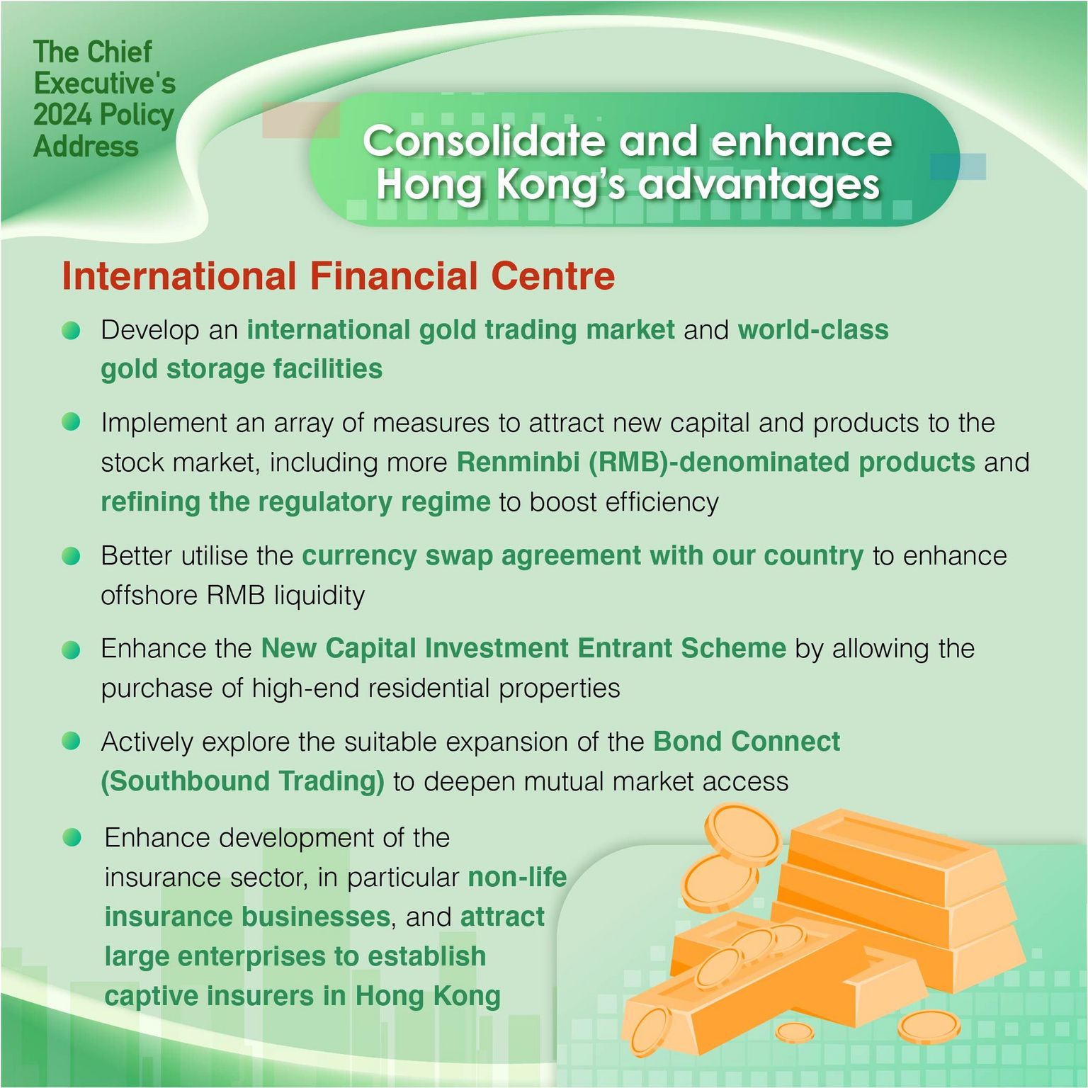 - Implement measures to attract new capital and products to the stock market, including more Renminbi (RMB)-denominated products and better utilise the currency swap agreement