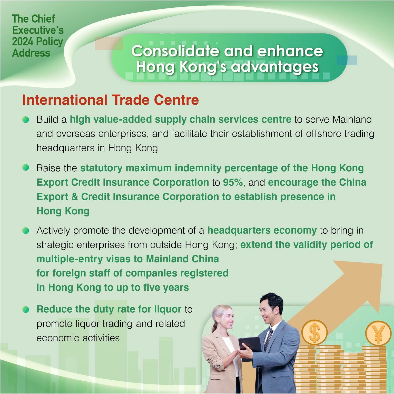 - Encourage the China Export & Credit Insurance Corporation to establish presence in Hong Kong
