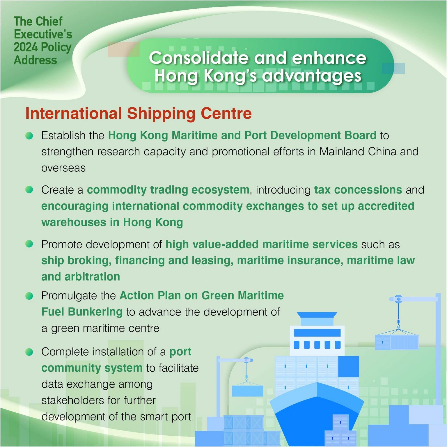 - Establish the Hong Kong Maritime and Port Development Board