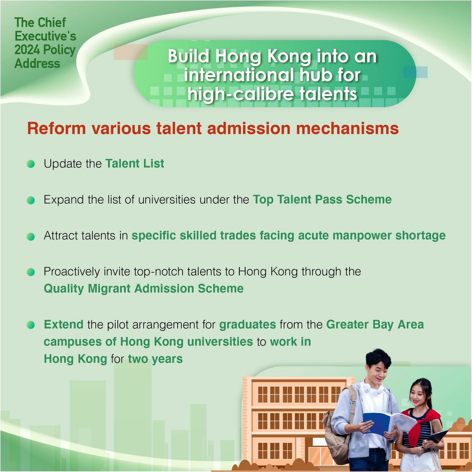 - Extend the pilot arrangement for graduates from the Greater Bay Area campuses of Hong Kong universities to work in Hong Kong for two years