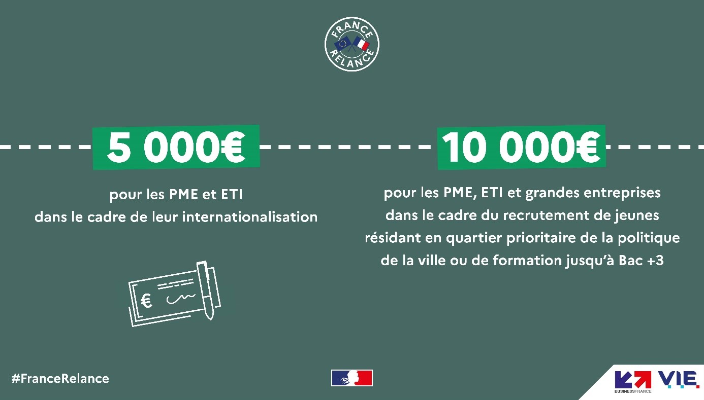 Pour rappel, le montant du Chèque Relance V.I.E est de 5 000 € HT par mission V.I.E (avec un nombre maximal de 2 chèques par entreprise).