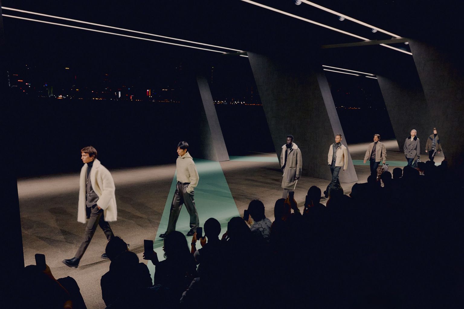 A cast of Hong Kong personalities joins the models on the runway, weaving through the slants of concrete. The crush of velvet and the patina of rubberised calfskin glimmer in the light. The warmth of blanket-finished parkas beckons. The sketch of a new equestrian geometry, all promises and surprises.